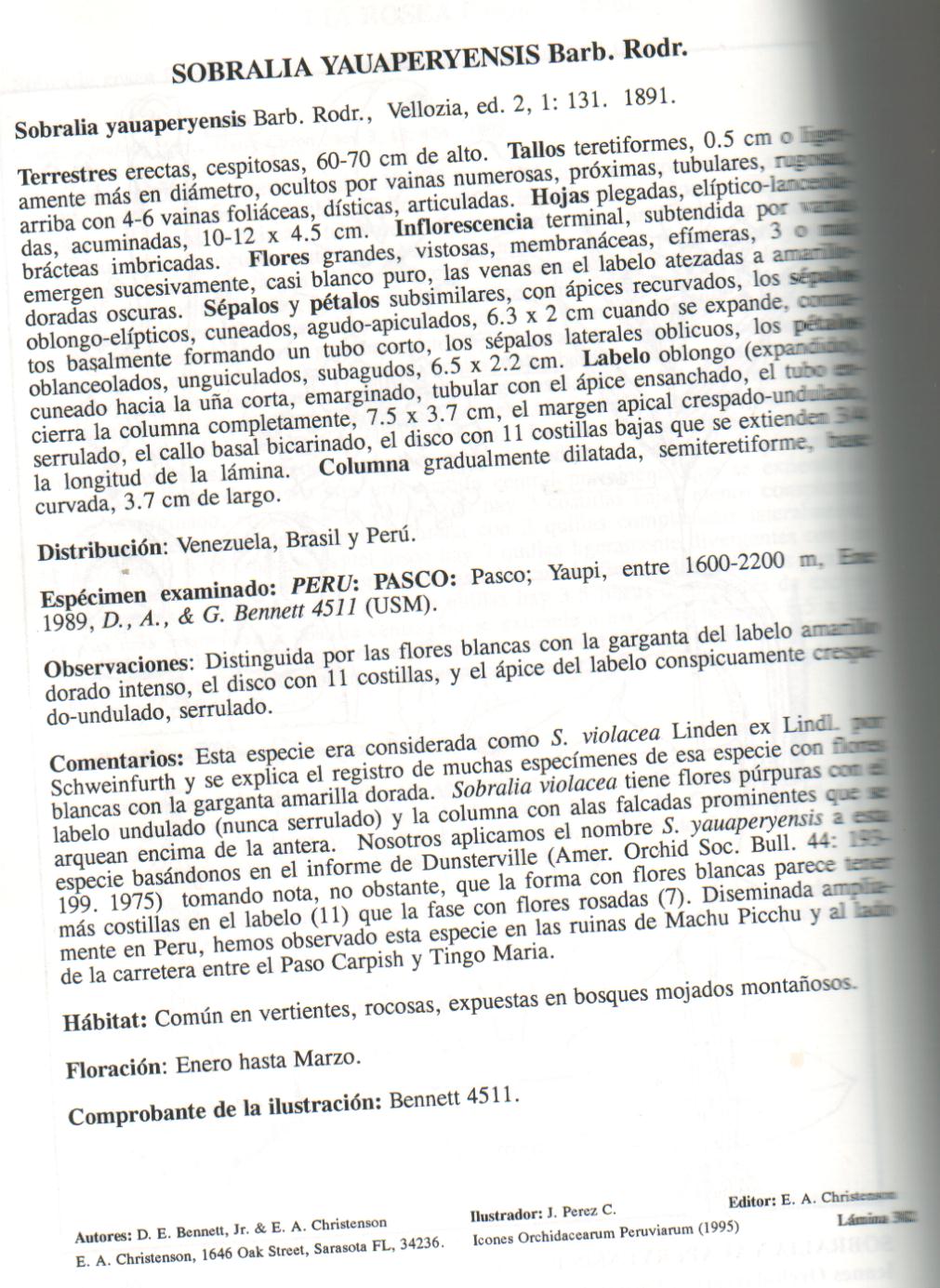 In 1995, David E. Bennett and Christenson published plates 201-400 of the Icones Orchidacearum Peruviarum, and included "Sobralia yauaperyensis" in that compilation. He says "Our pl. 382 is Sobralia virginalis. We followed Dunsterville's S. yauaperyensis var. alba which is also S. virginalis. Sobralia virginalis is common in Peru and was called S. violacea by Schweinfurth who commented on how odd it was that all S. violacea in Peru were white-flowered, not violet." (pers. comm. 18 Dec. 2003).